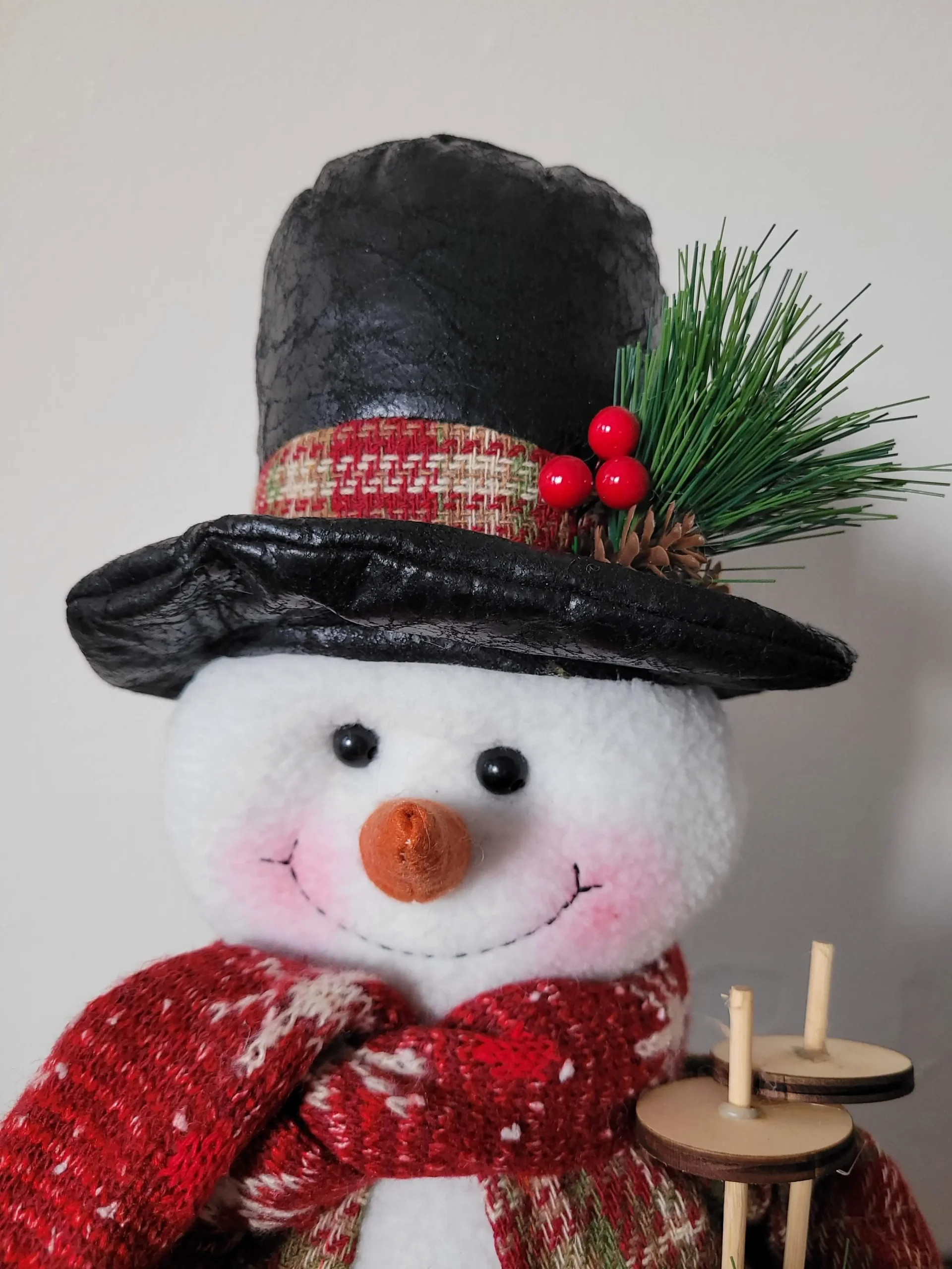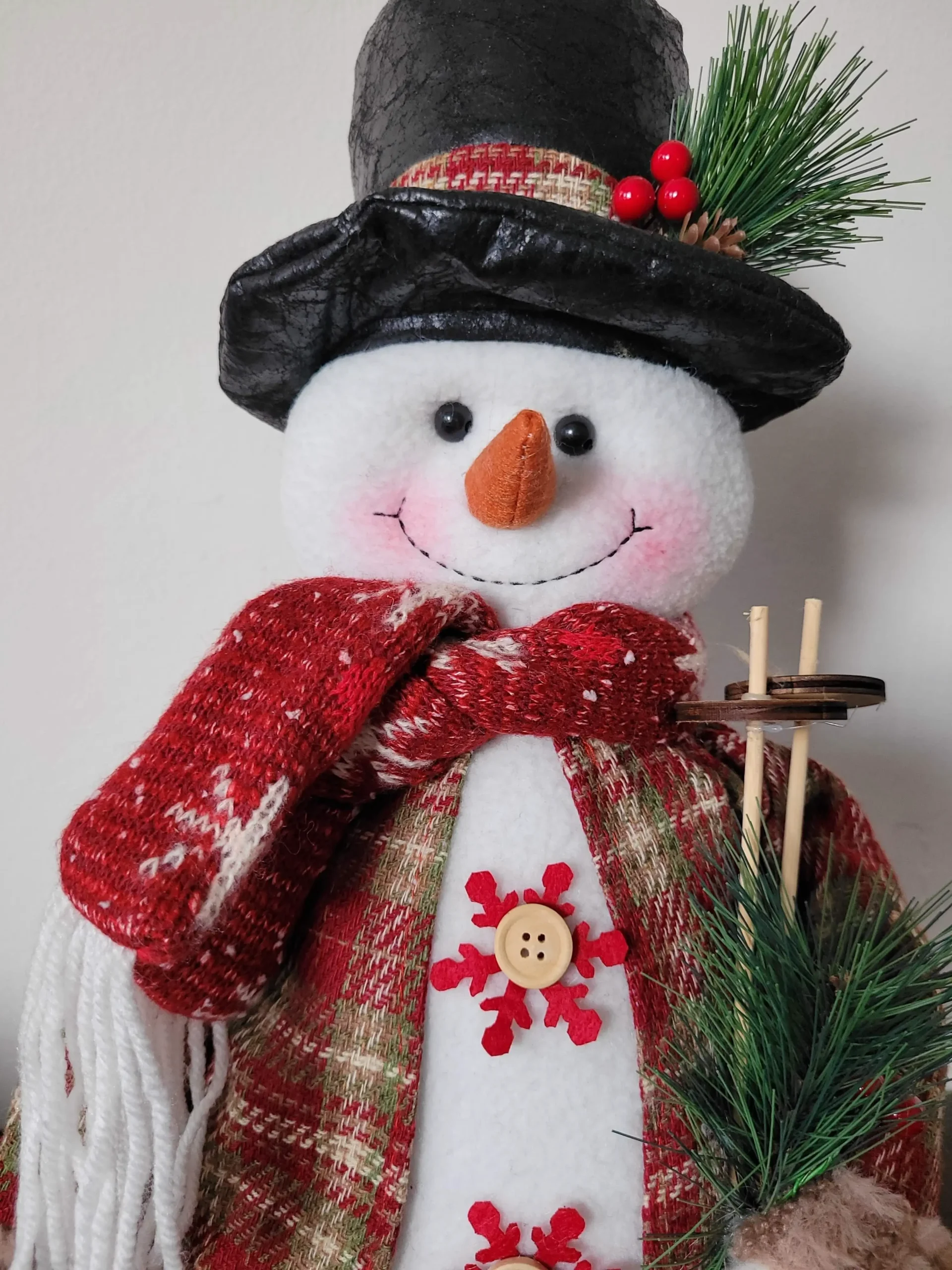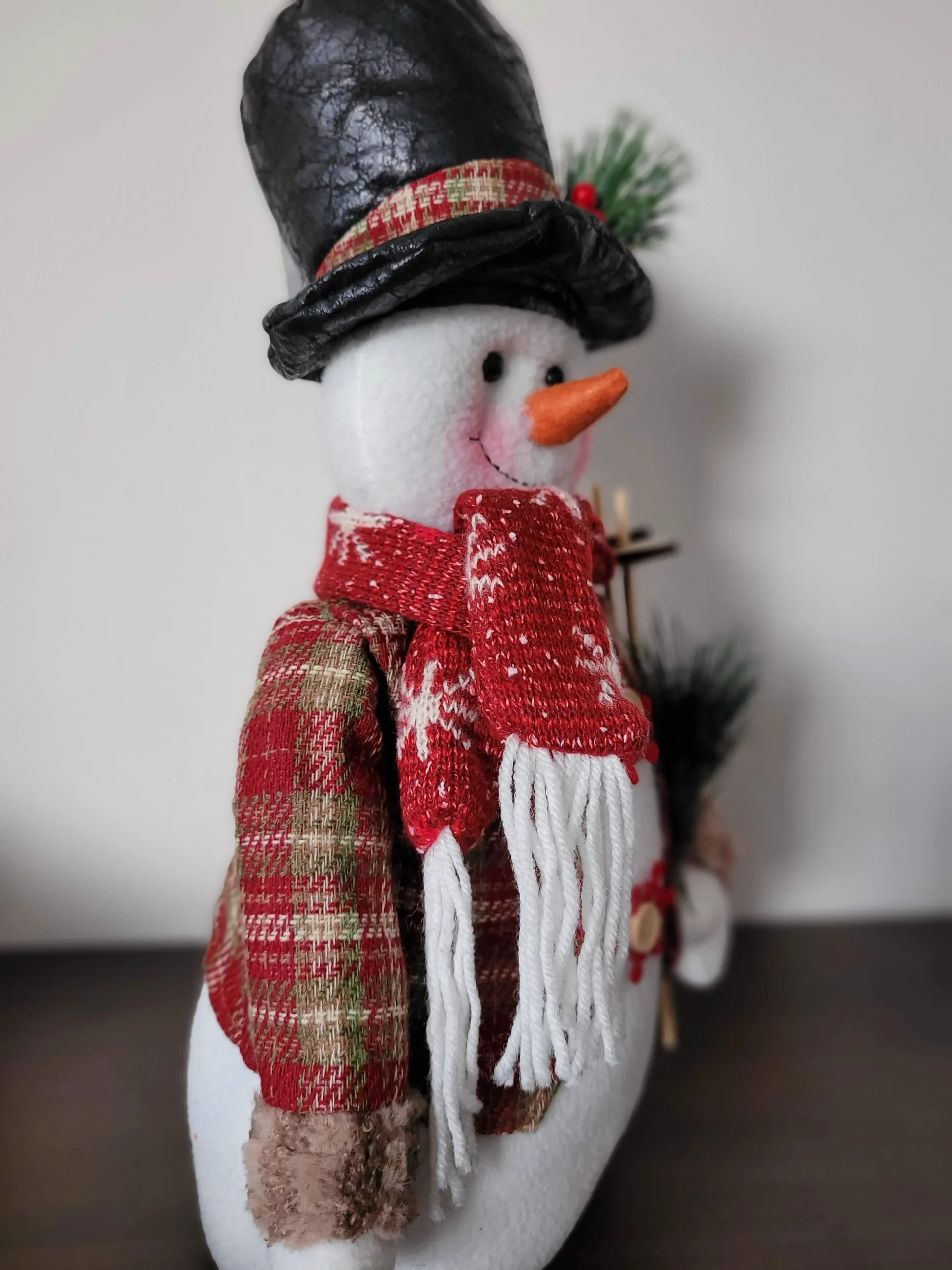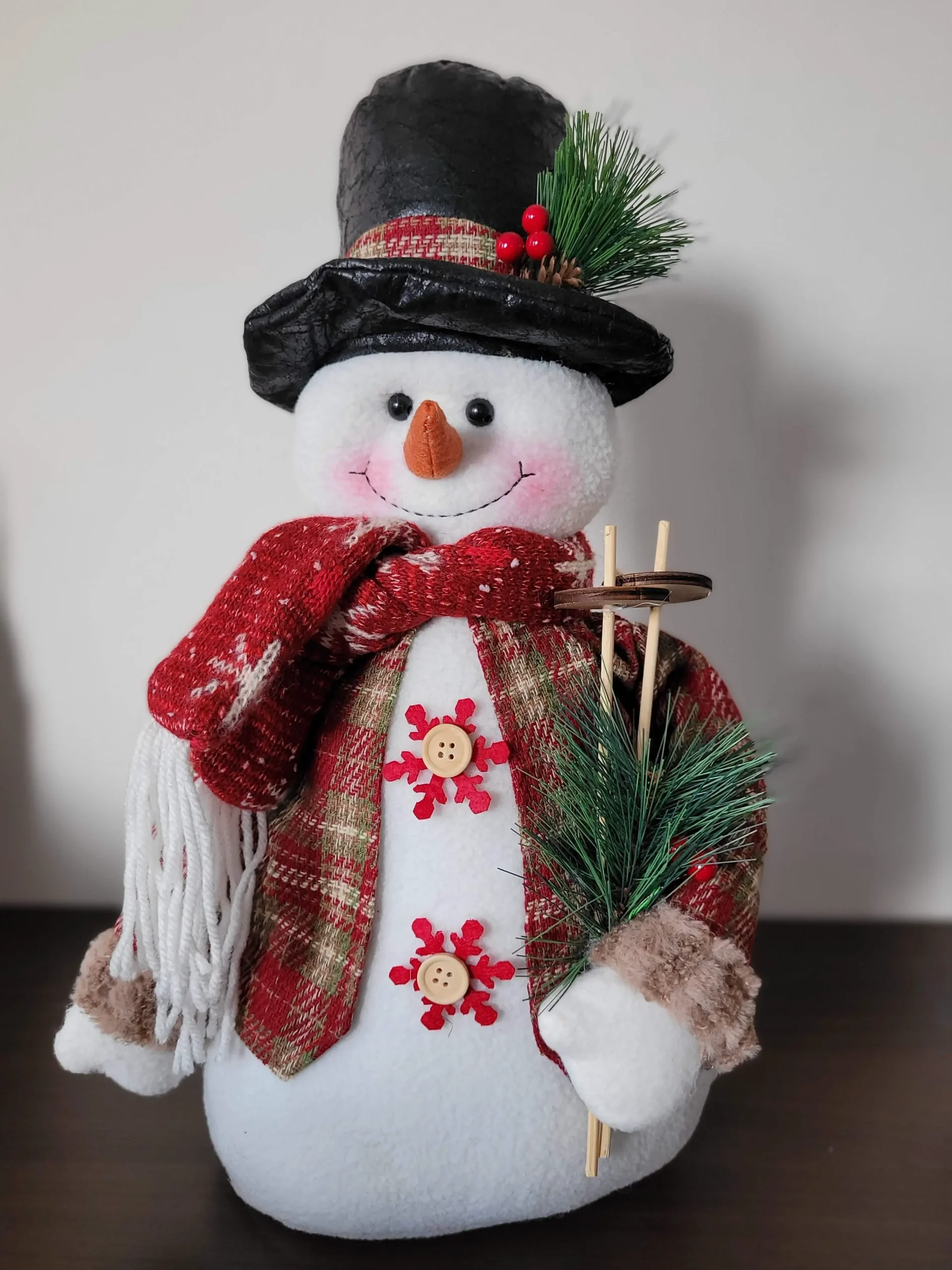Kézzel készített prémium termék. A testének anyaga kissé bolyhosított polárból készült. Szövött anyagból készült kozkás kabátot, hópehely mintás sálat és fekete textilbőr kalapot visel egy kis kockás betéttel. Bal kezével kettő darab fából készült túrabotot tart egy fenyőággal.