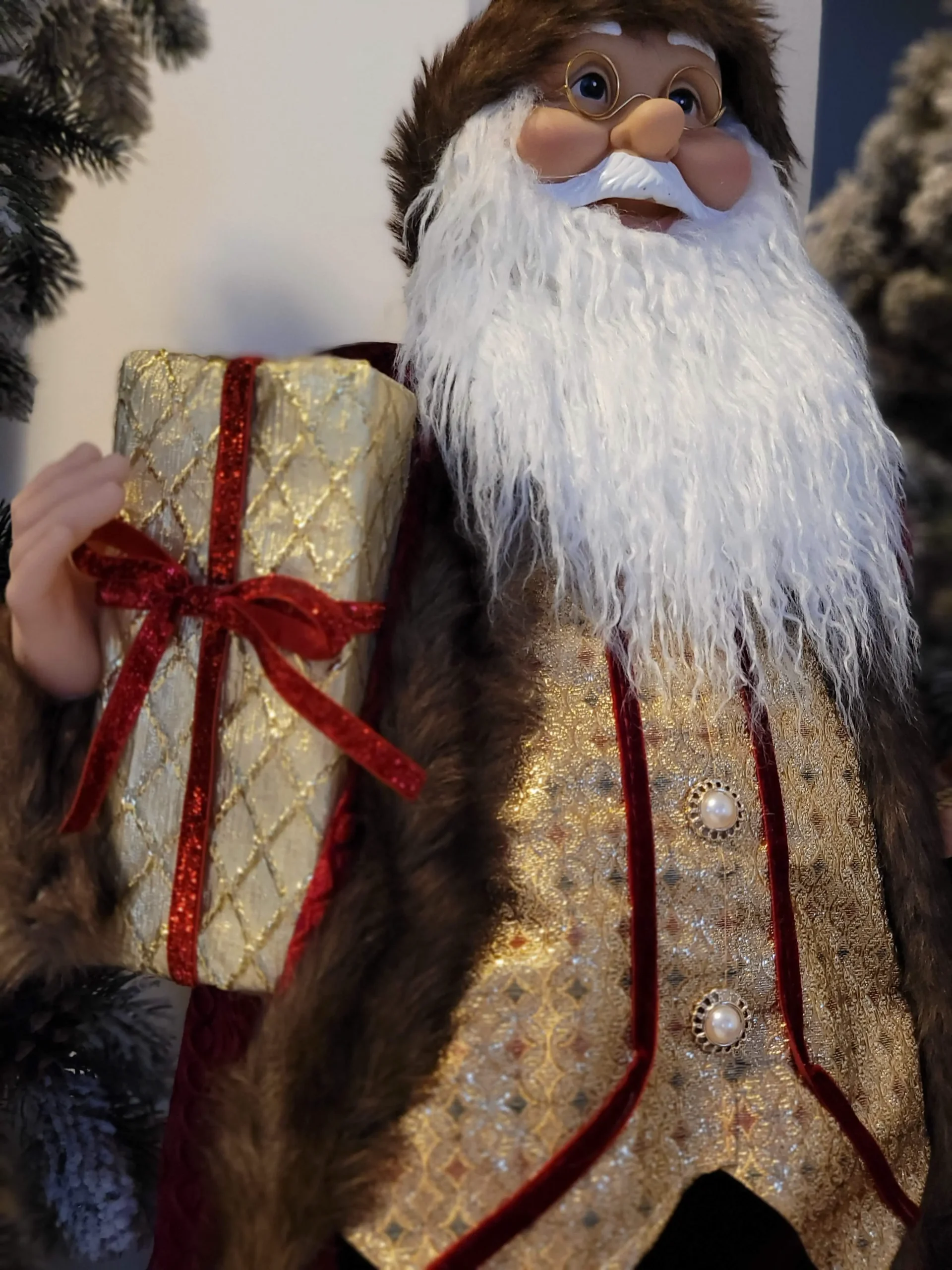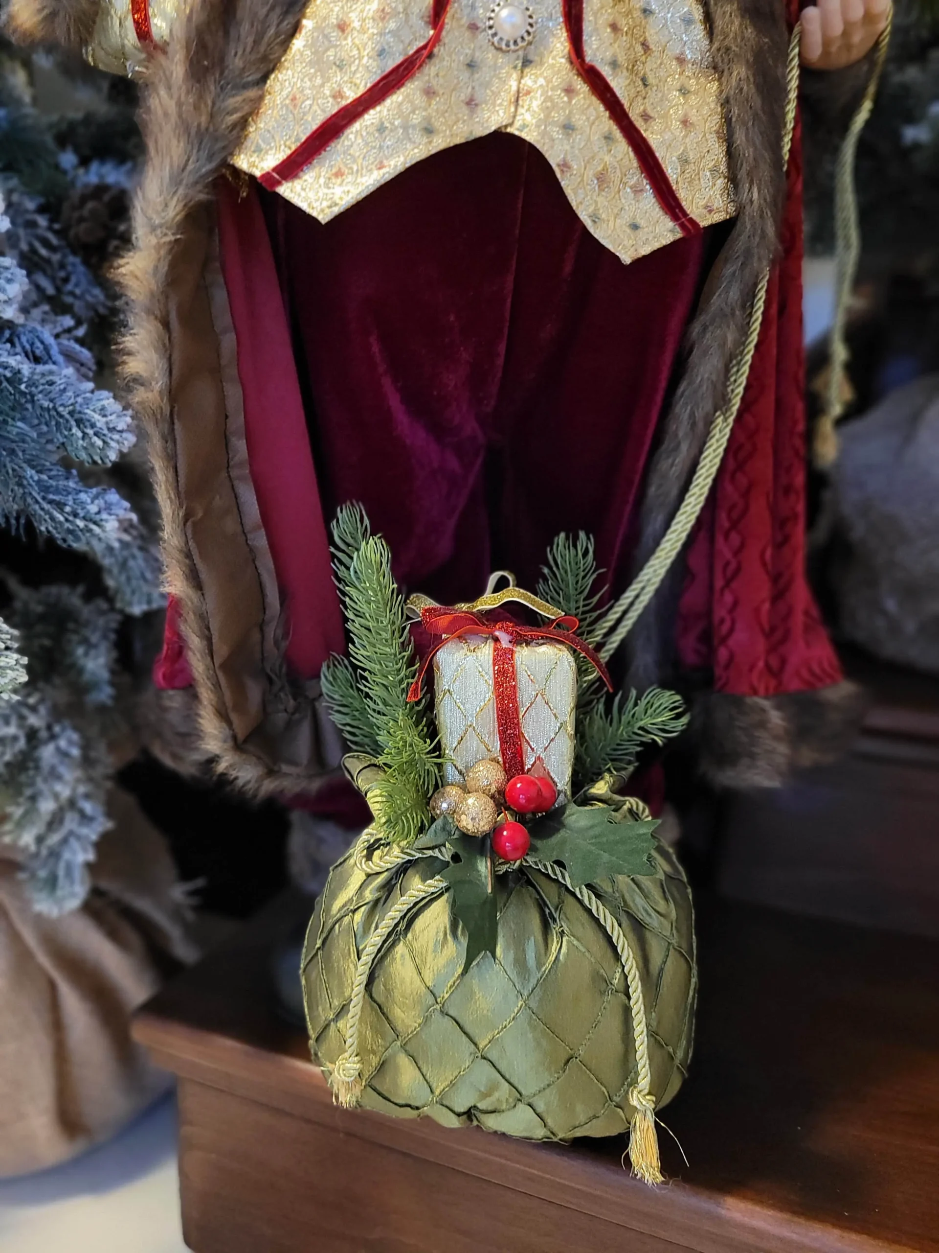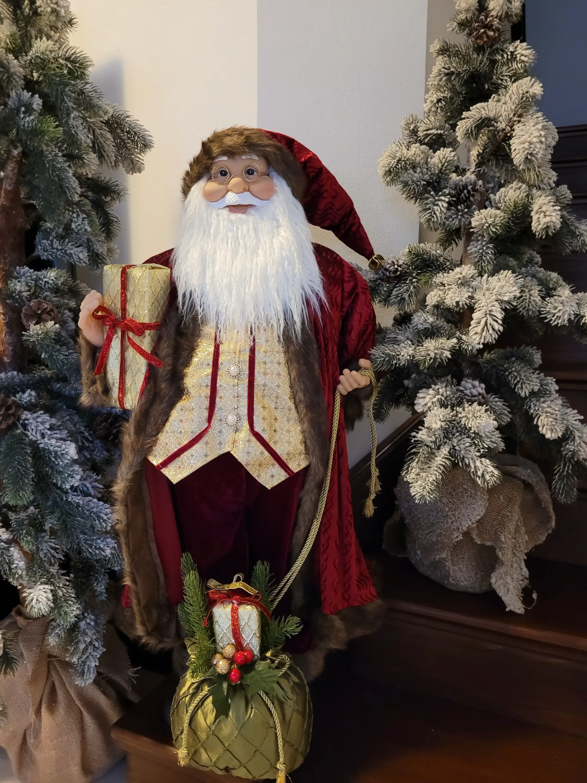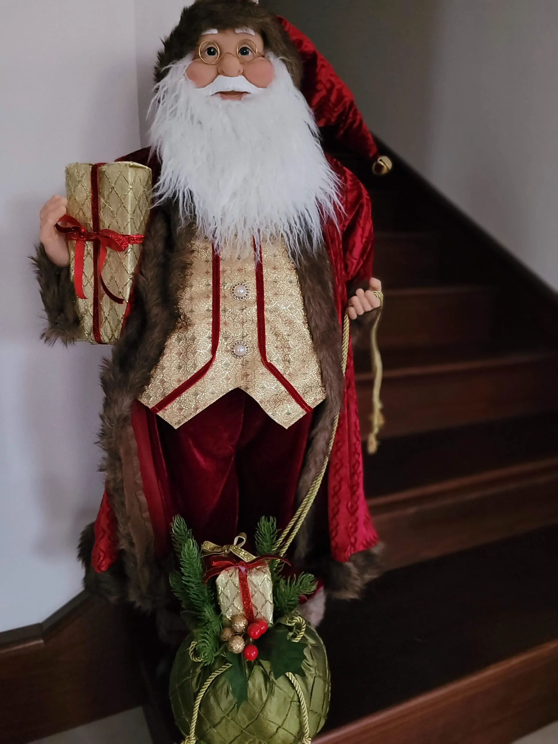 Nagyon mutatós és szépen kidolgozott, prémium minőségű Mikulás/ Télapó.Szakálla puha szőrméből készült. Bordó színű bársony kabátot és nadrágot visel, gyönyörű arany mellénnyel és díszes gombokkal. Jobb kezében egy ajándékot tart, bal kezével pedig ajándékzsákjának kötelét tartja.