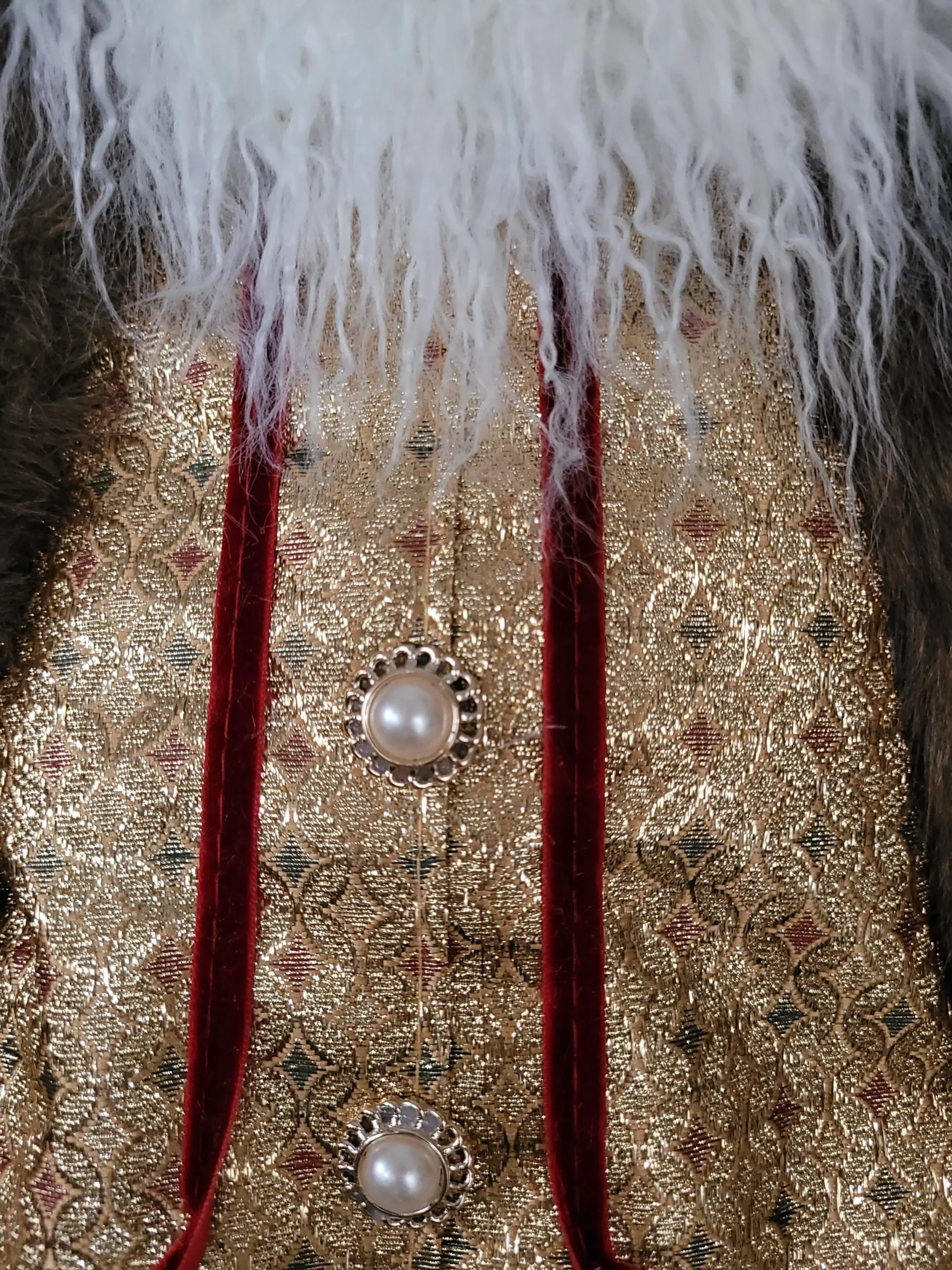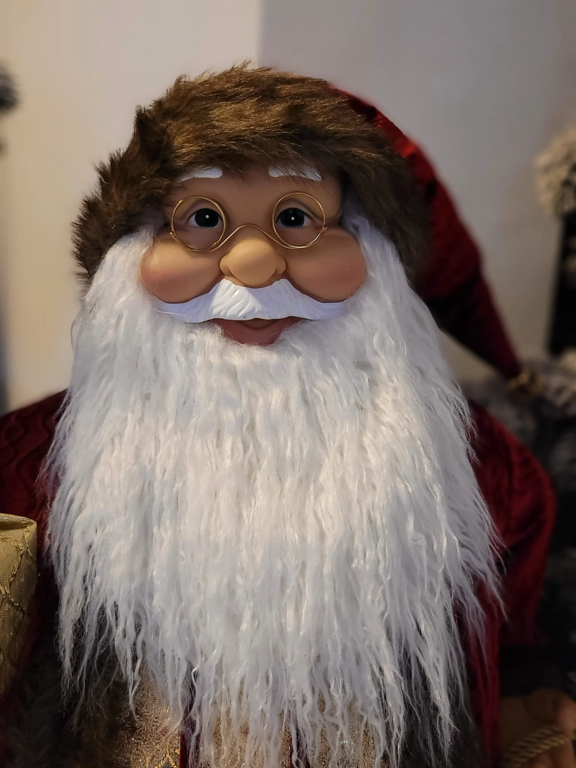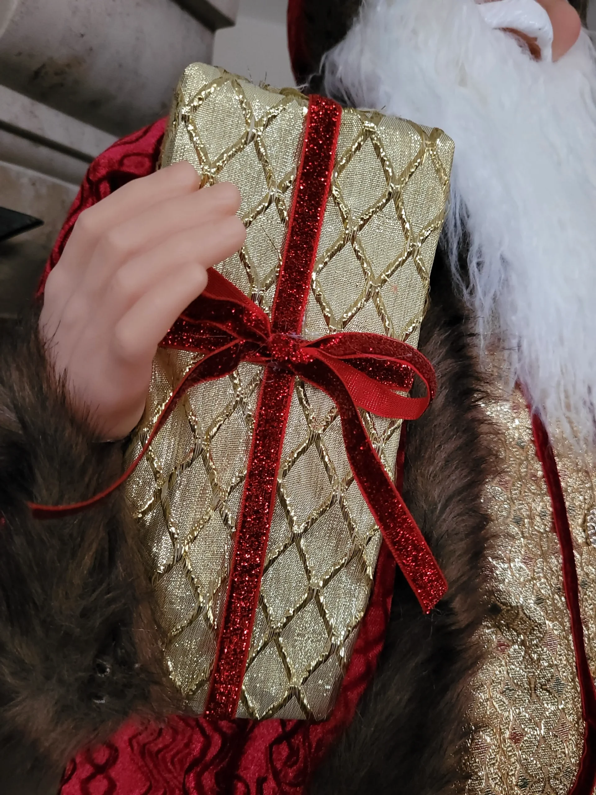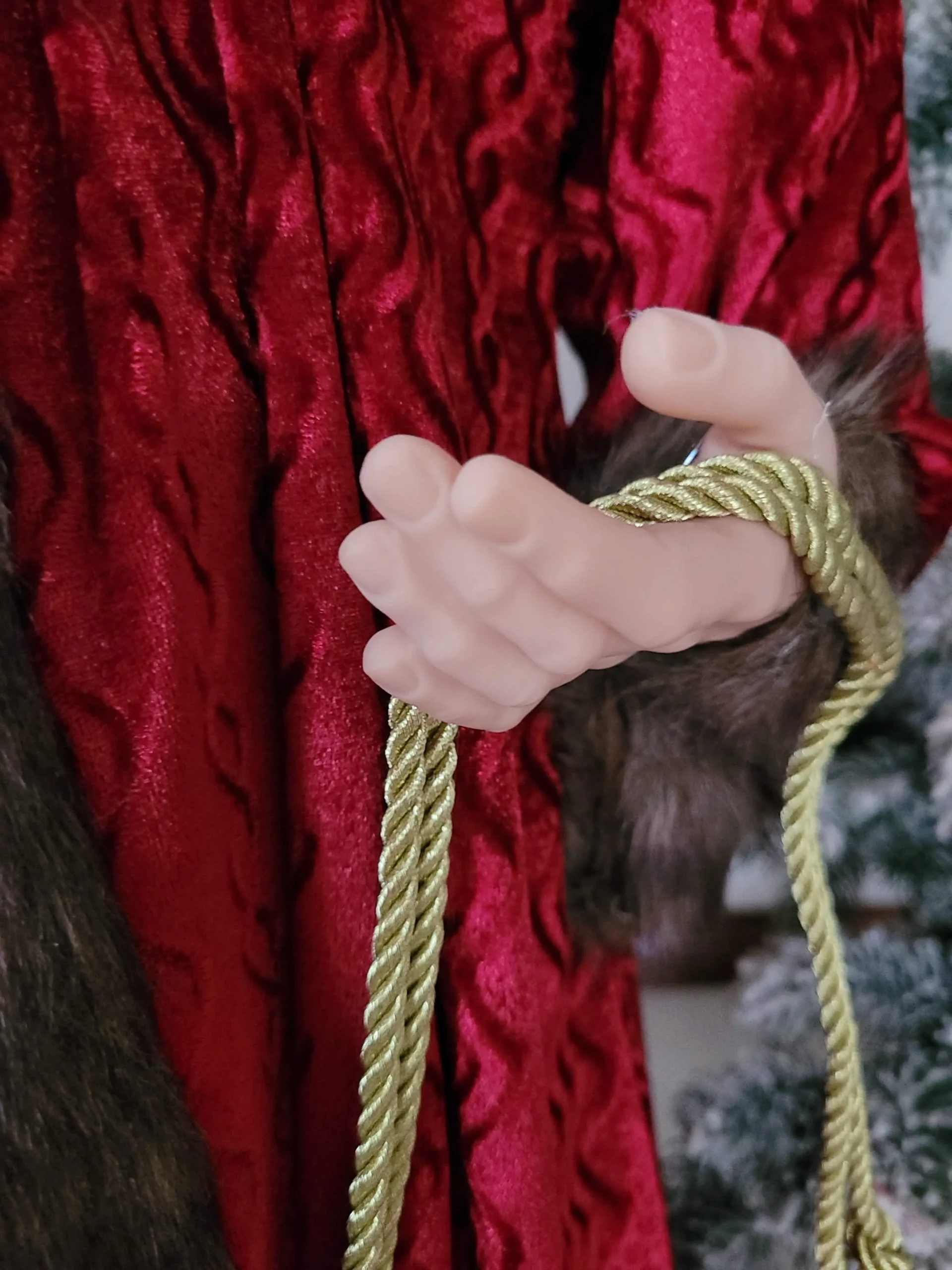 Nagyon mutatós és szépen kidolgozott, prémium minőségű Mikulás/ Télapó.Szakálla puha szőrméből készült. Bordó színű bársony kabátot és nadrágot visel, gyönyörű arany mellénnyel és díszes gombokkal. Jobb kezében egy ajándékot tart, bal kezével pedig ajándékzsákjának kötelét tartja.