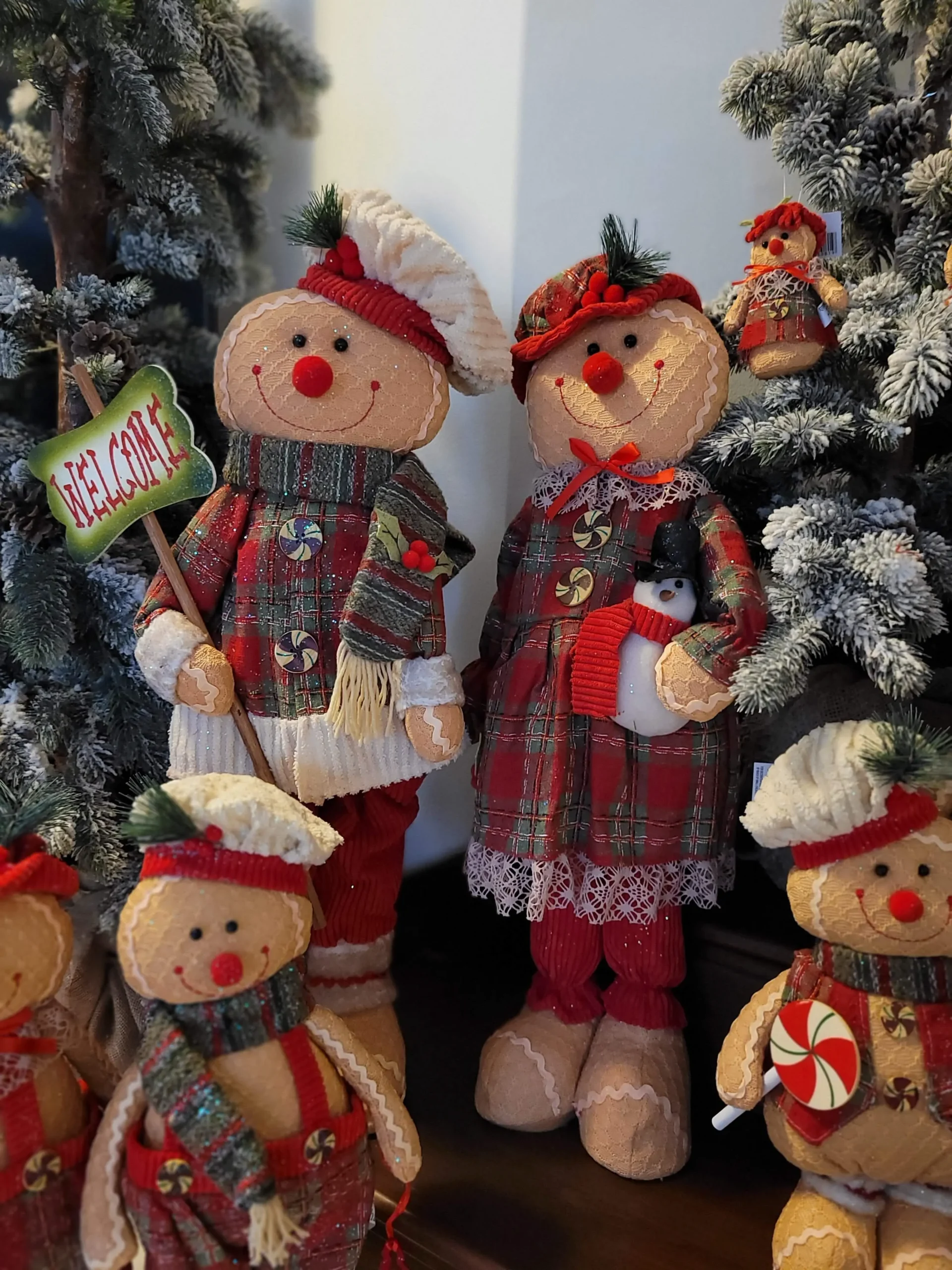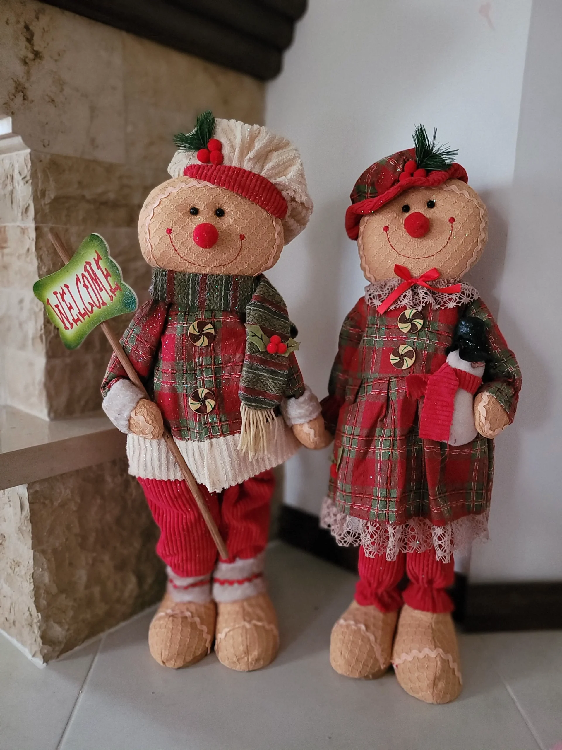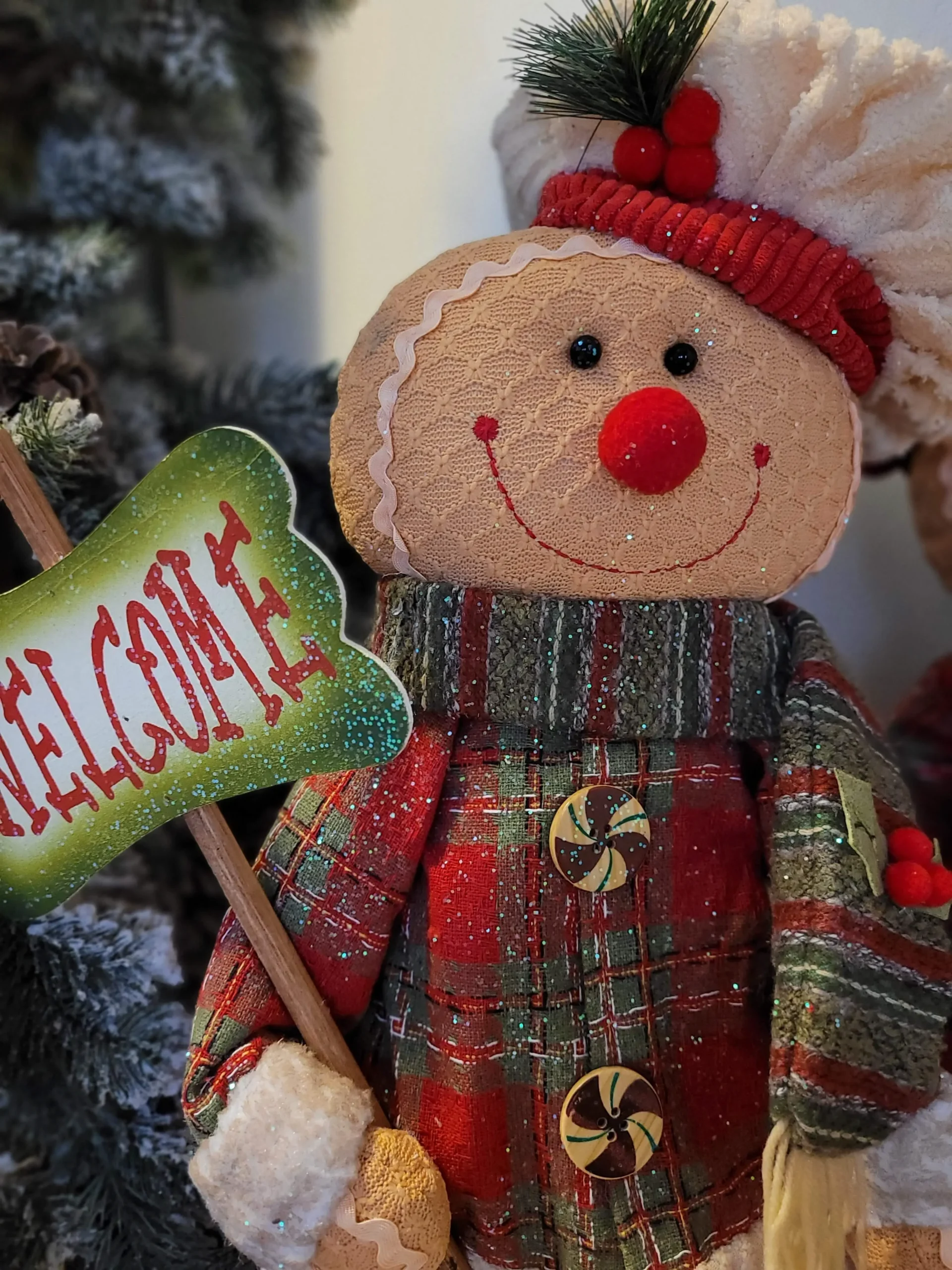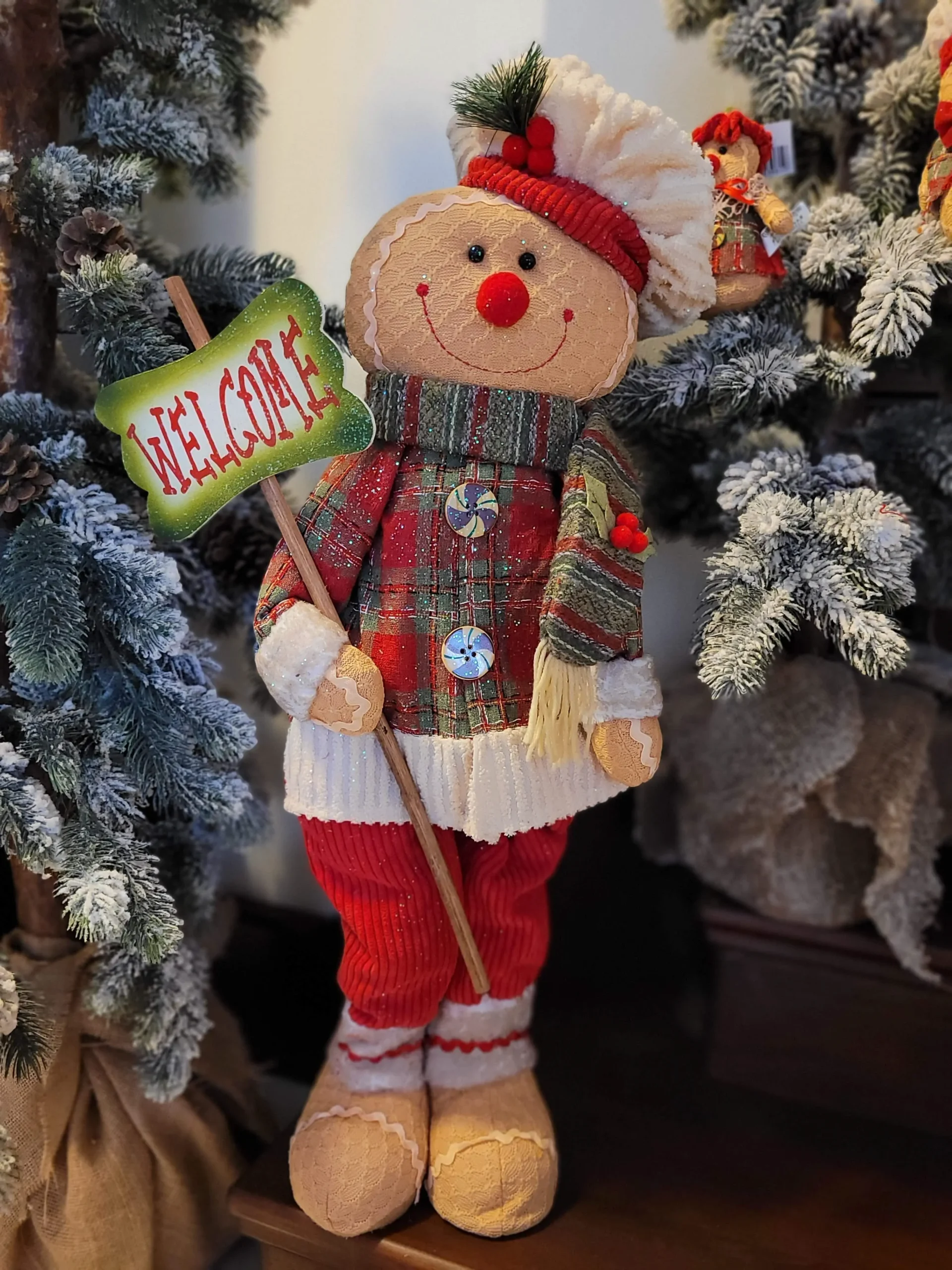 Rusztikus stílusú, kézzel készített prémium termék. Piros kordbársony nadrágot, kockás szövött kabátot, régi stílusú szövött sálat és egy világos kordbársony sapkát visel. A jobb kezével egy fából készült üdvözlő táblát tart, welcome felirattal. Az egész termék ízlésesen meg van szórva csillámmal a karácsonyi hangulat fokozásáért. Rendíkül bájos és mutatós termék!