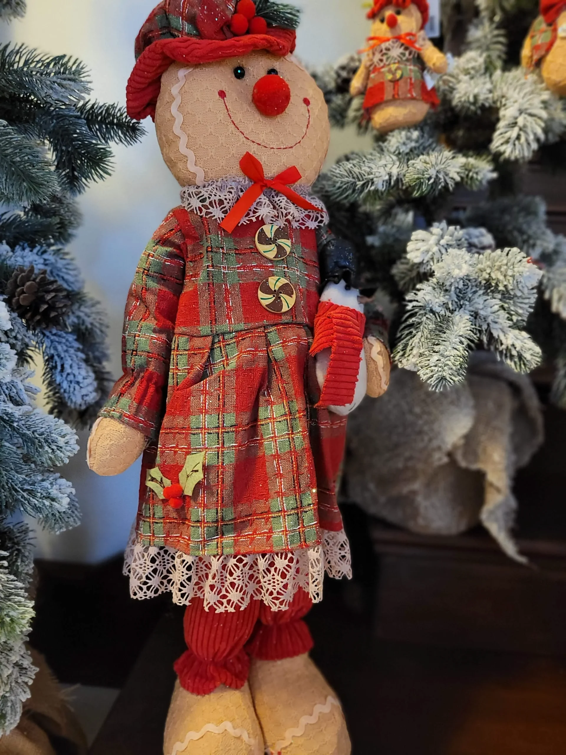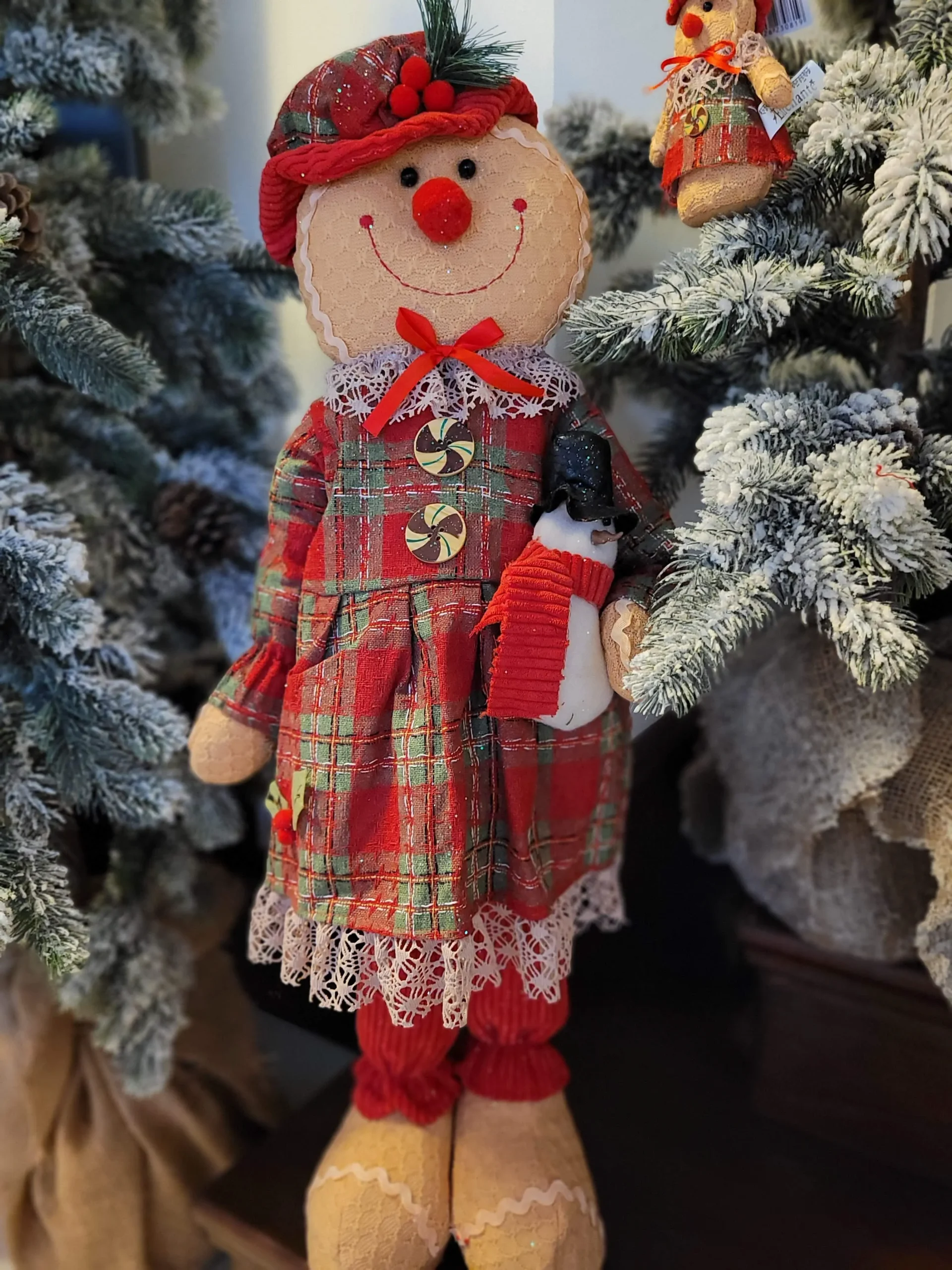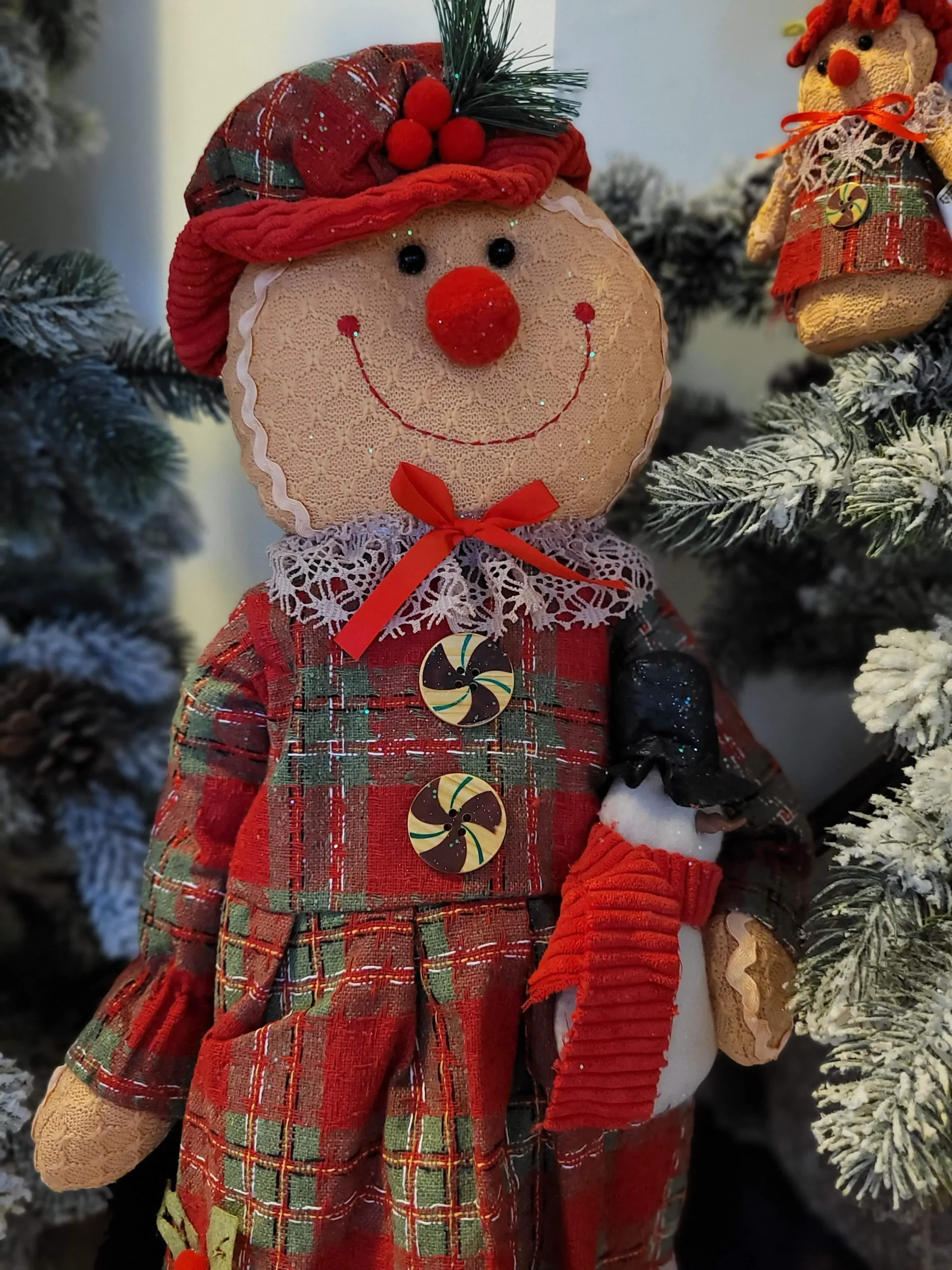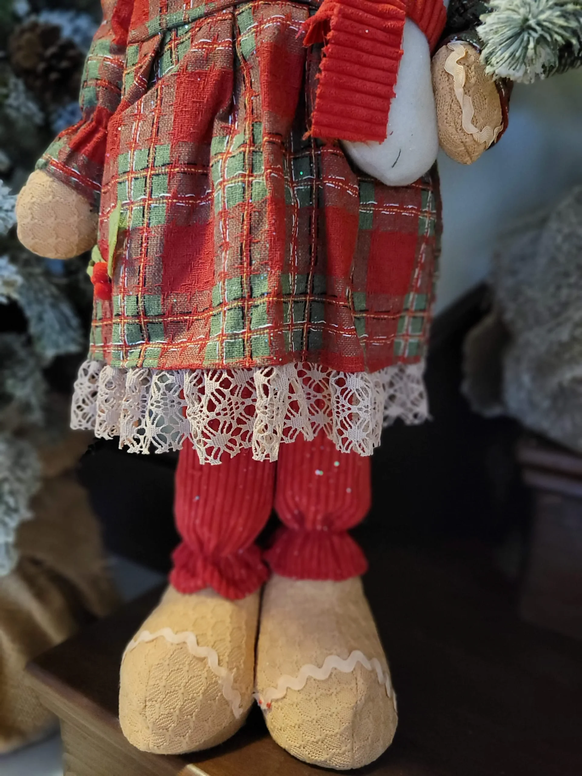 Rusztikus stílusú, kézzel készített prémium termék. Szövött kockás anyagból készült ruhát és kalapot visel, piros kordbársony nadrággal. Bal kezében egy aranyos kis hóembert tart. Az egész termék ízlésesen meg van szórva csillámmal a karácsonyi hangulat fokozásáért. Rendkívűl mutatós és bájos termék!