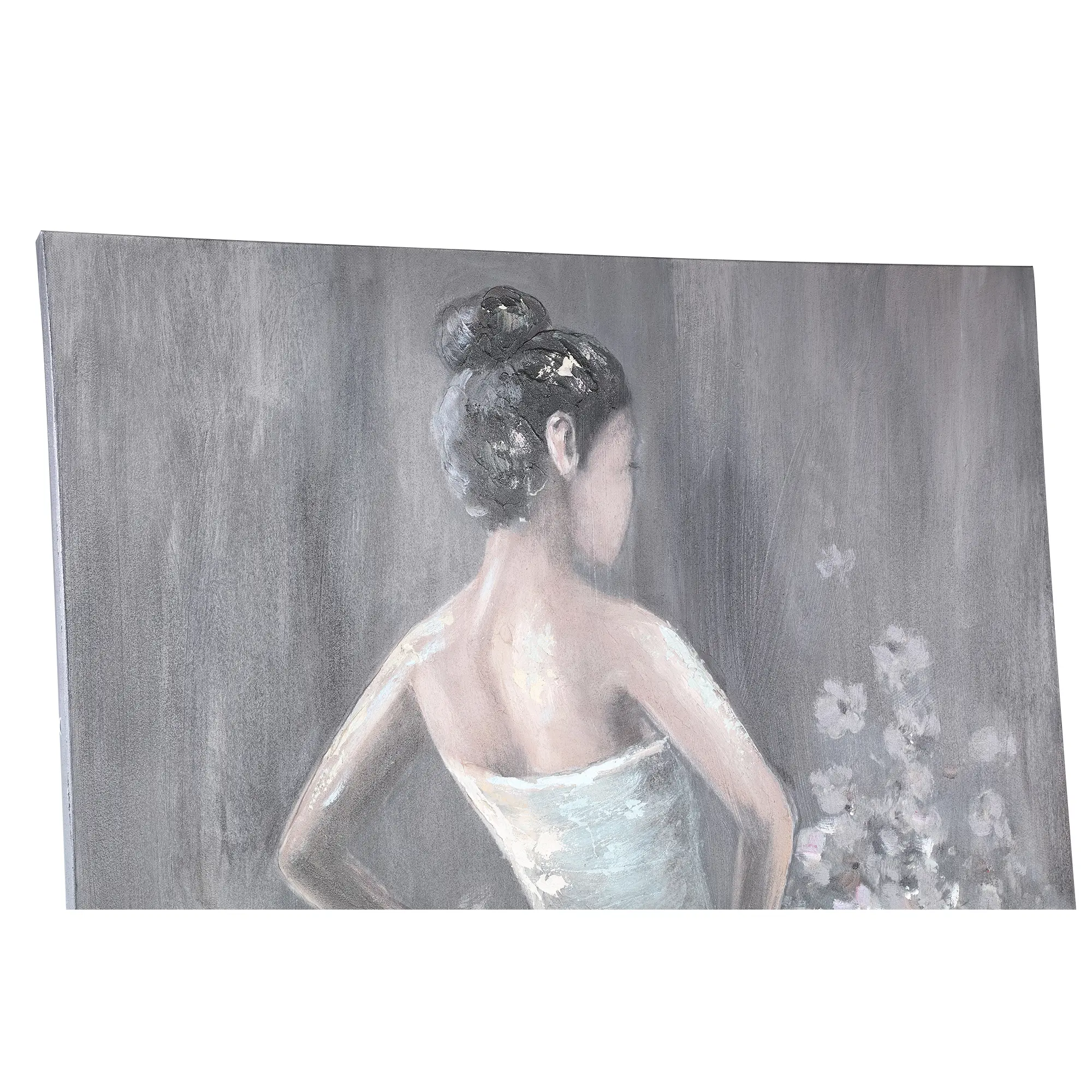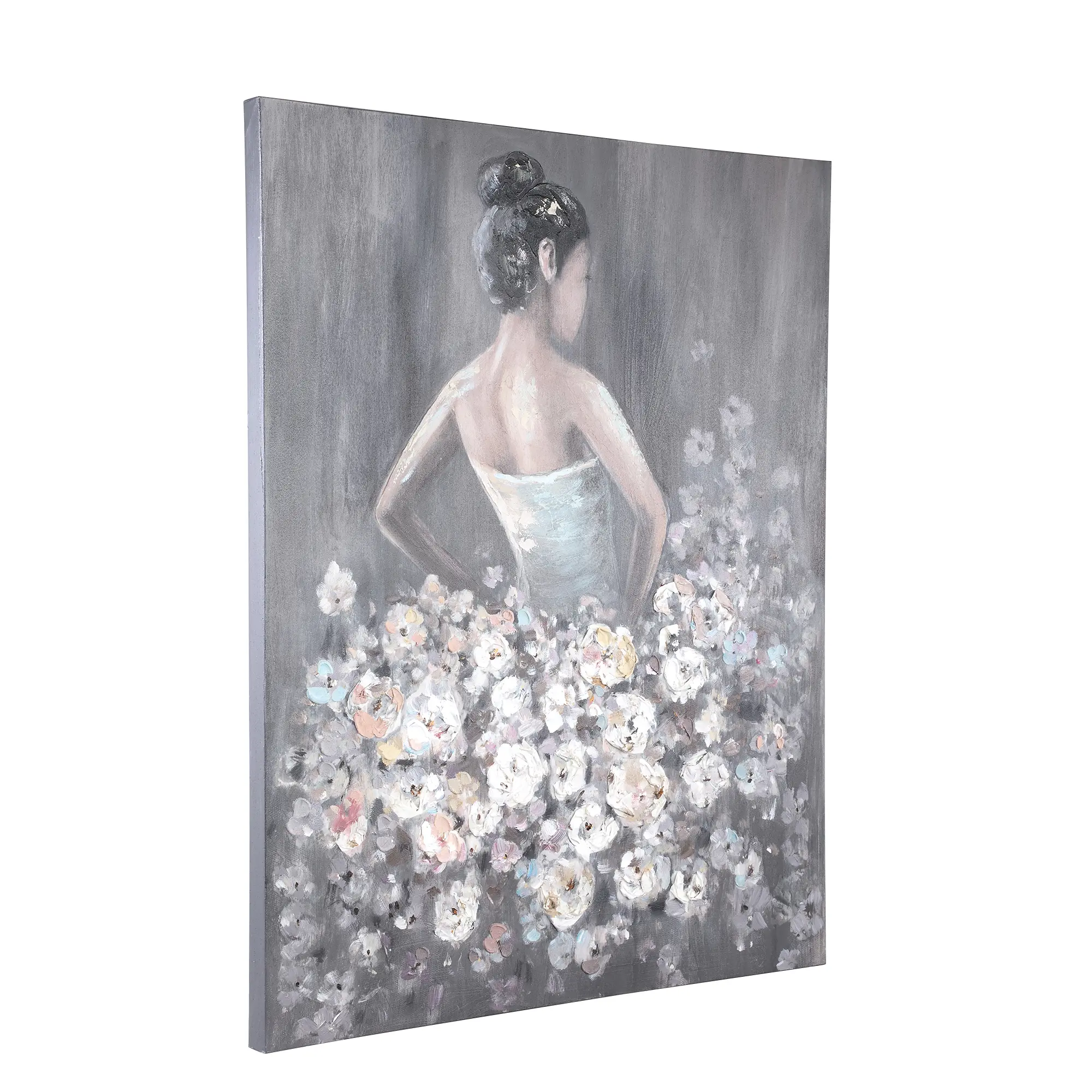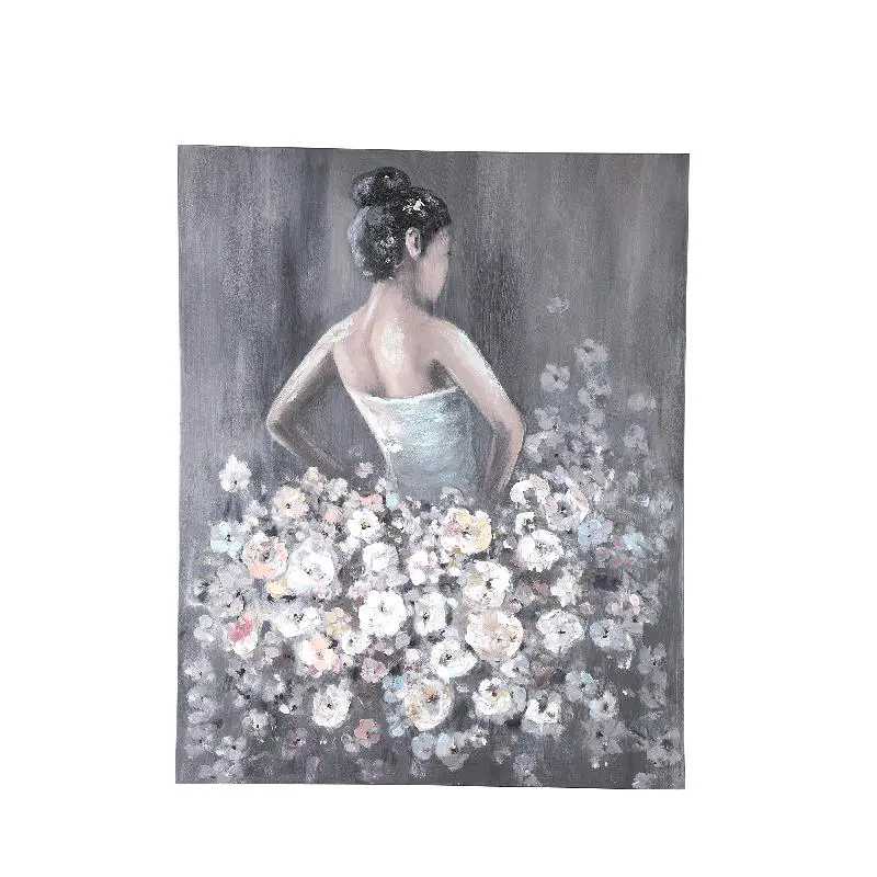 A Daiven Grey festmény különlegessége a kézzel készített részletekben rejlik. A vászonra festett női alak finom, érzékeny mozdulatokkal van ábrázolva, miközben a virágos szoknya színeivel és mintájával a természet szépségét idézi. A festmény színvilága, amely a szürke árnyalataiban és pasztell tónusokban játszik, egy nyugodt és elegáns atmoszférát teremt a térben, miközben a női figura a nőiesség és a szépérzék szimbóluma. A festői technika és a finom ecsetvonások egyedülálló, autentikus hangulatot adnak a műalkotásnak.