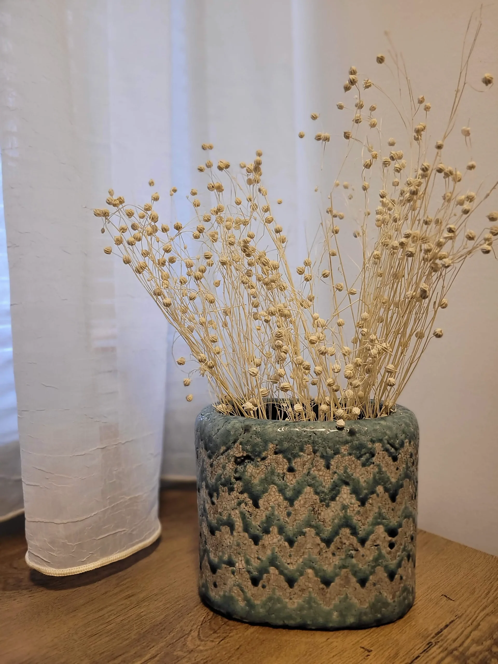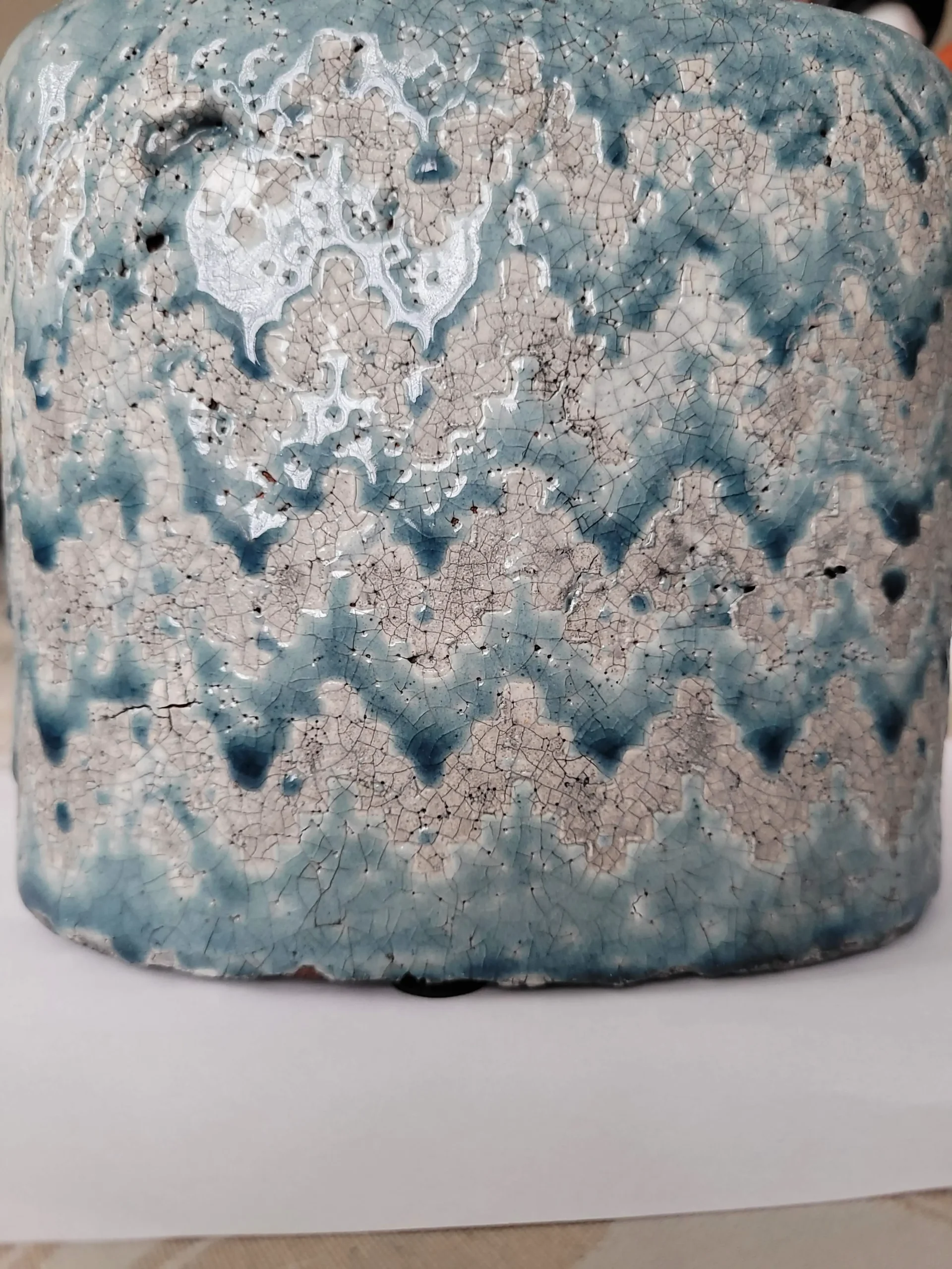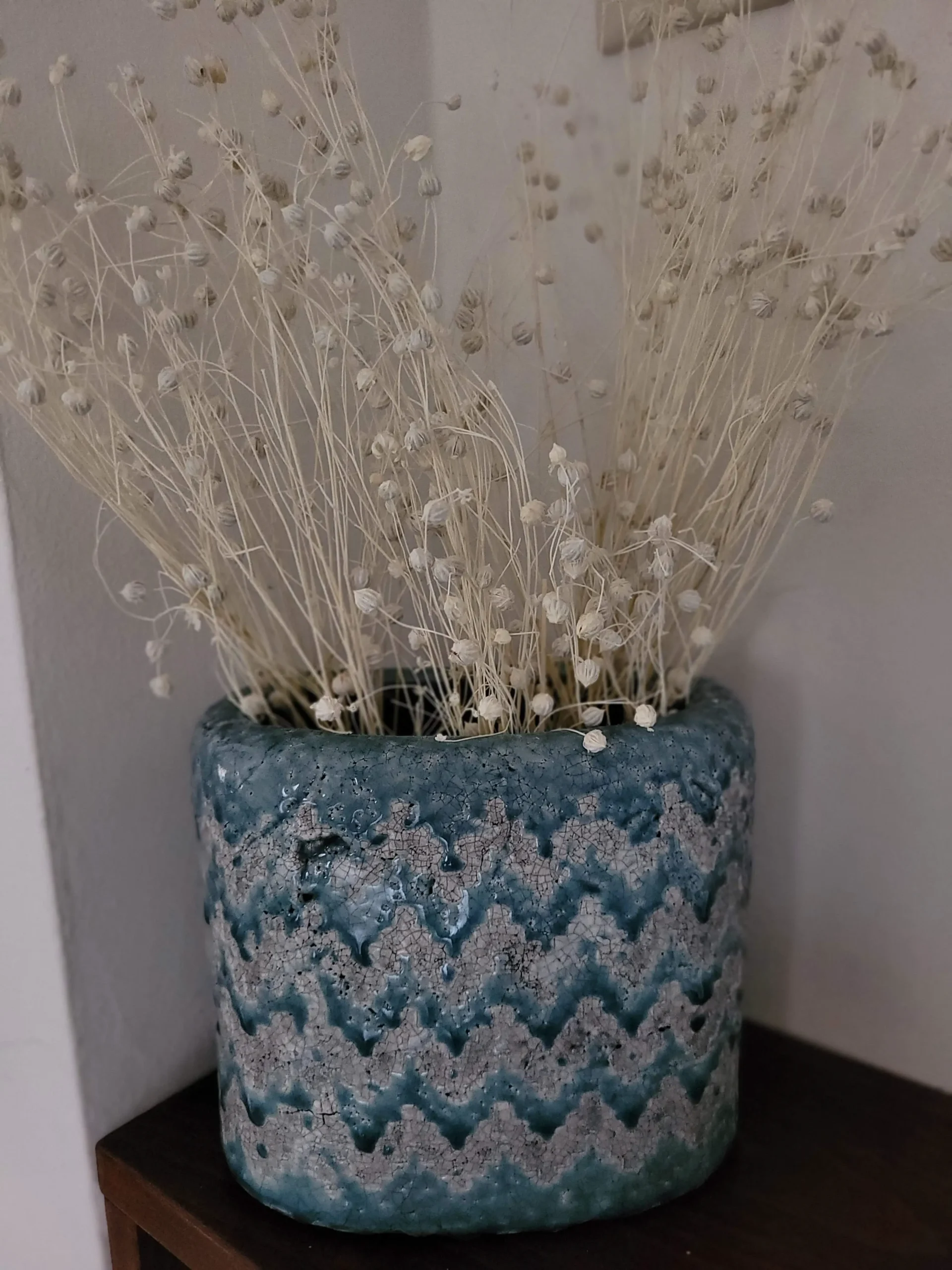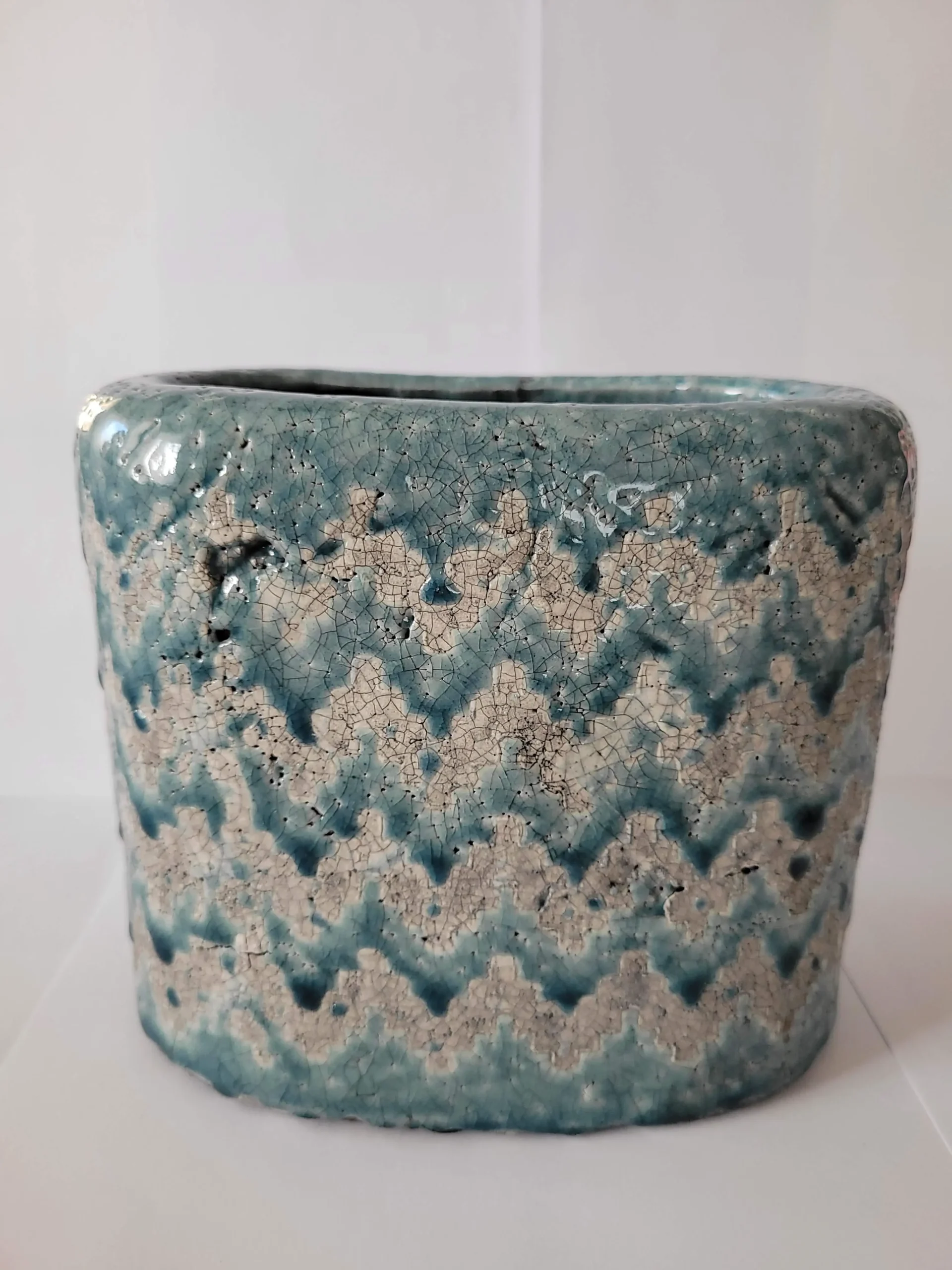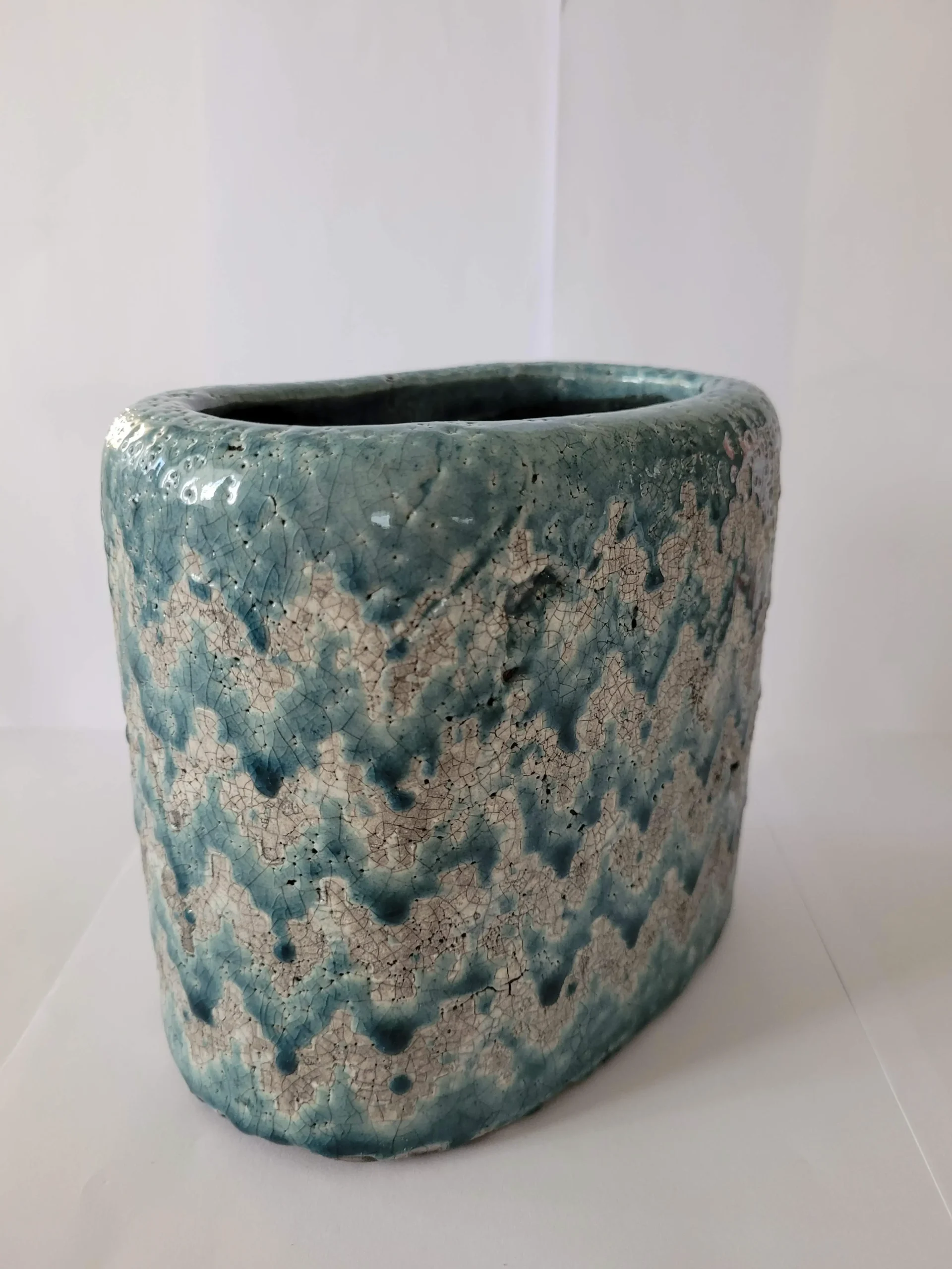 Mediterrán stílusú, kézzel készített prémium termék. Belseje teljesen, külseje pedig ahol kék ott mázas. Méretéből adódóan leginkább száraz vagy művirággal érdemes dekorálni, de saját készítésű egyedi dekorációk is jól mutat benne. Abban az esetben, ha élővirágnak szánnánk, akkor agyaggranulátummal az alján beleültetve ajánljuk!