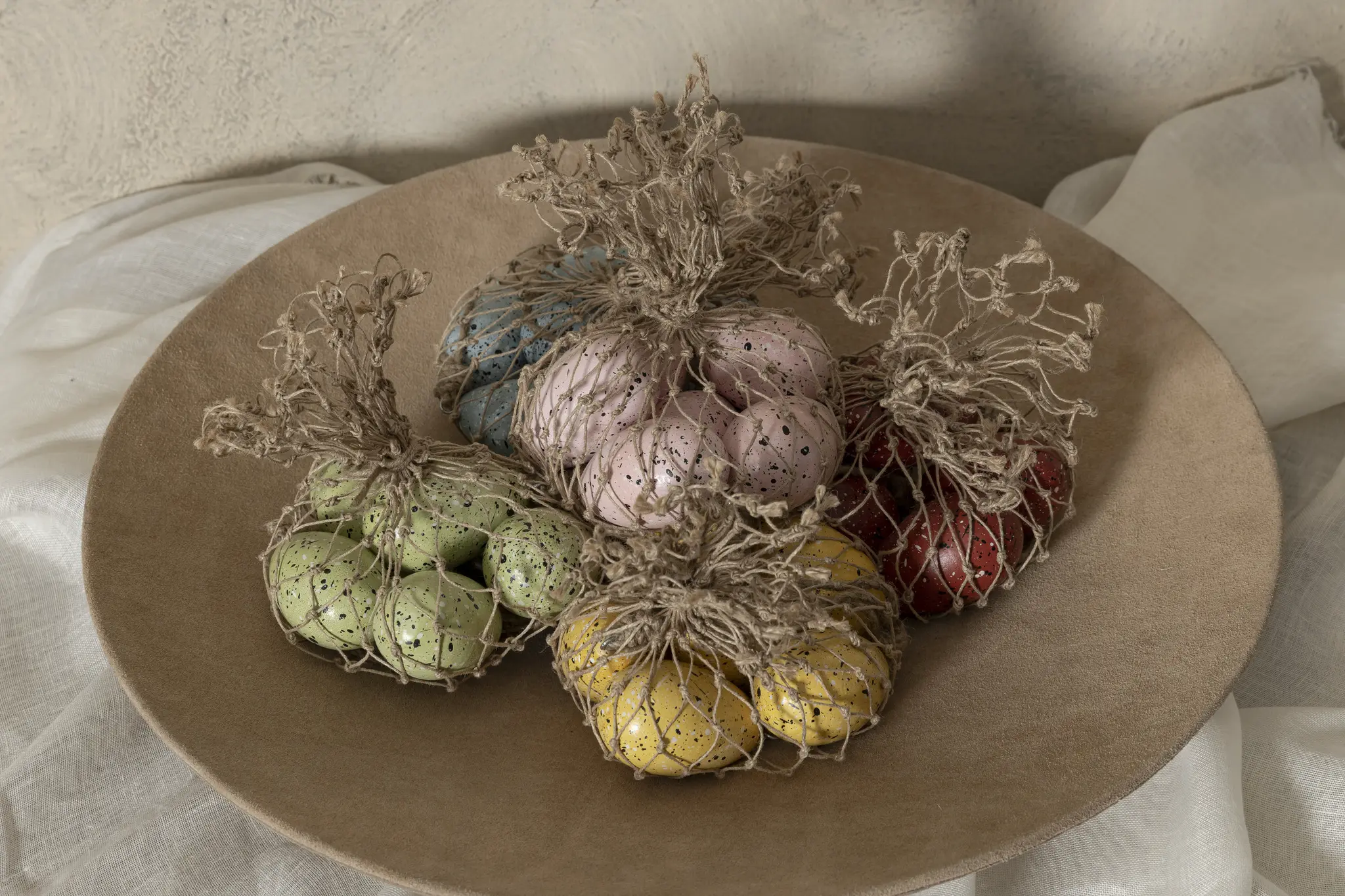 Mindegyik tojás akasztóval van ellátva, így könnyedén felhelyezhetők dekoratív ágakra, koszorúkra vagy húsvéti díszítésként különböző kompozíciókba. A szett 6 darab tojást tartalmaz, amelyeket természetes hatású kenderhálóba csomagoltak, tovább erősítve a rusztikus, természetközeli megjelenést.