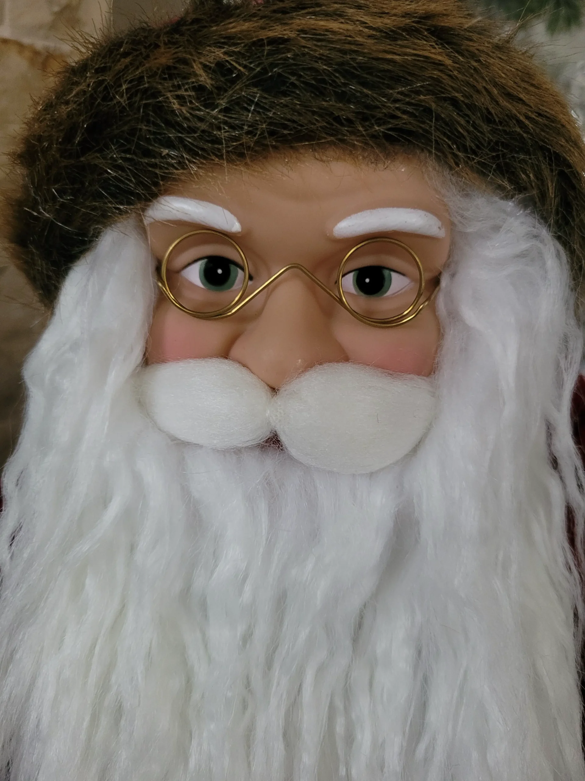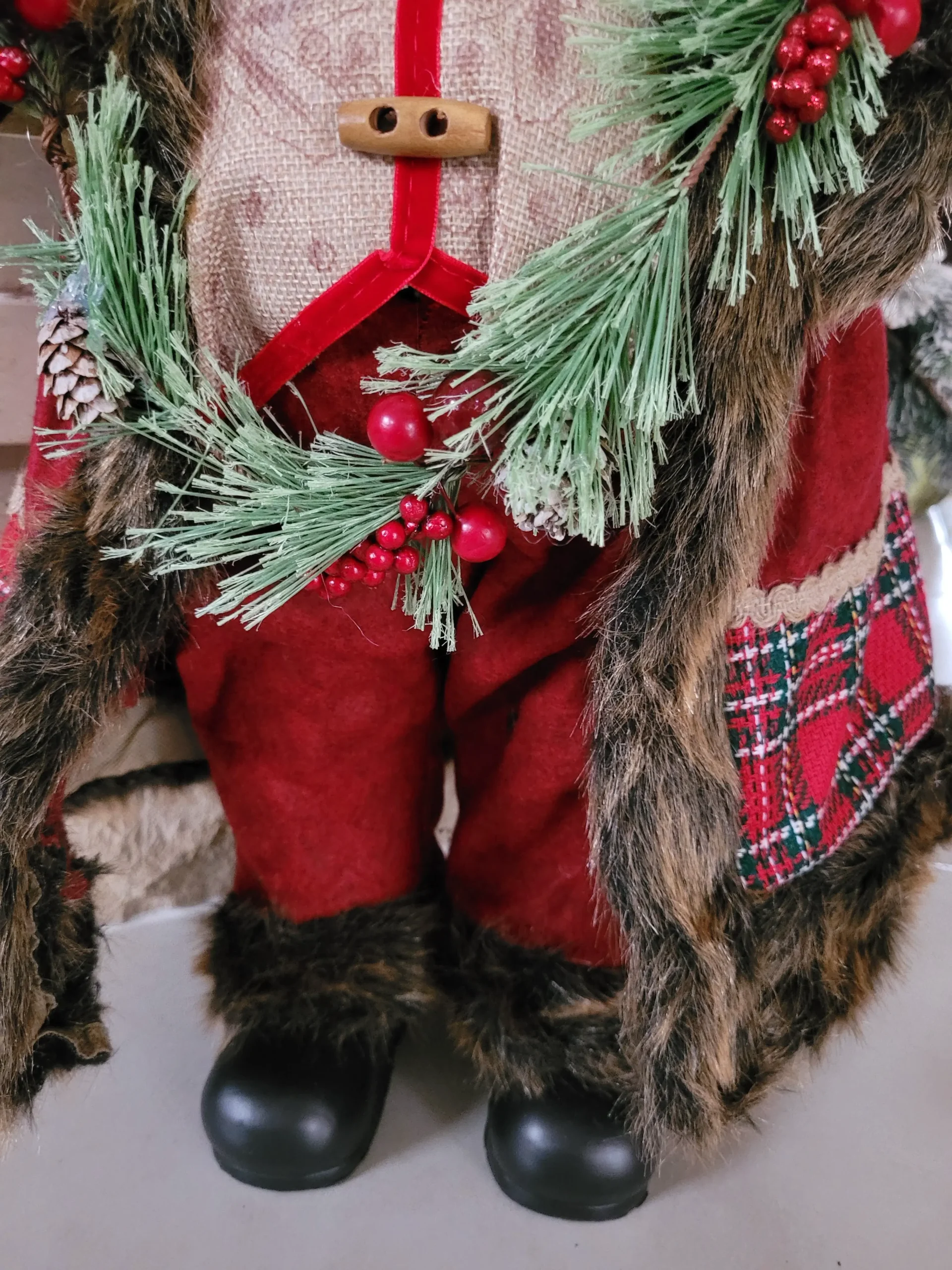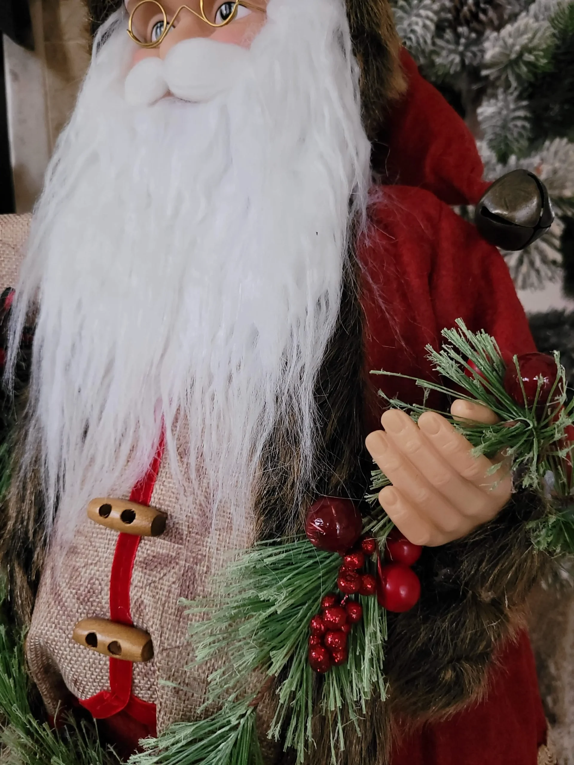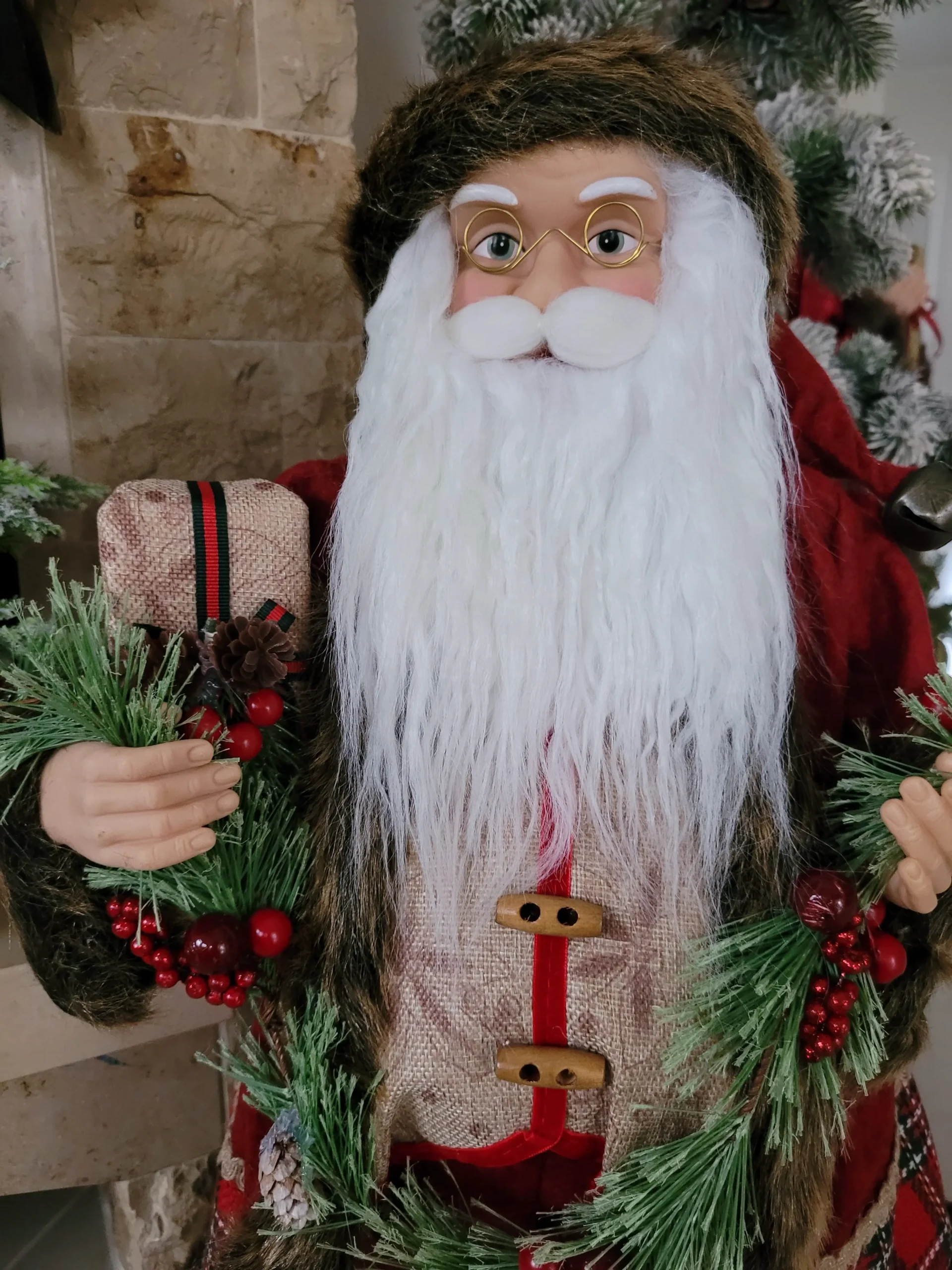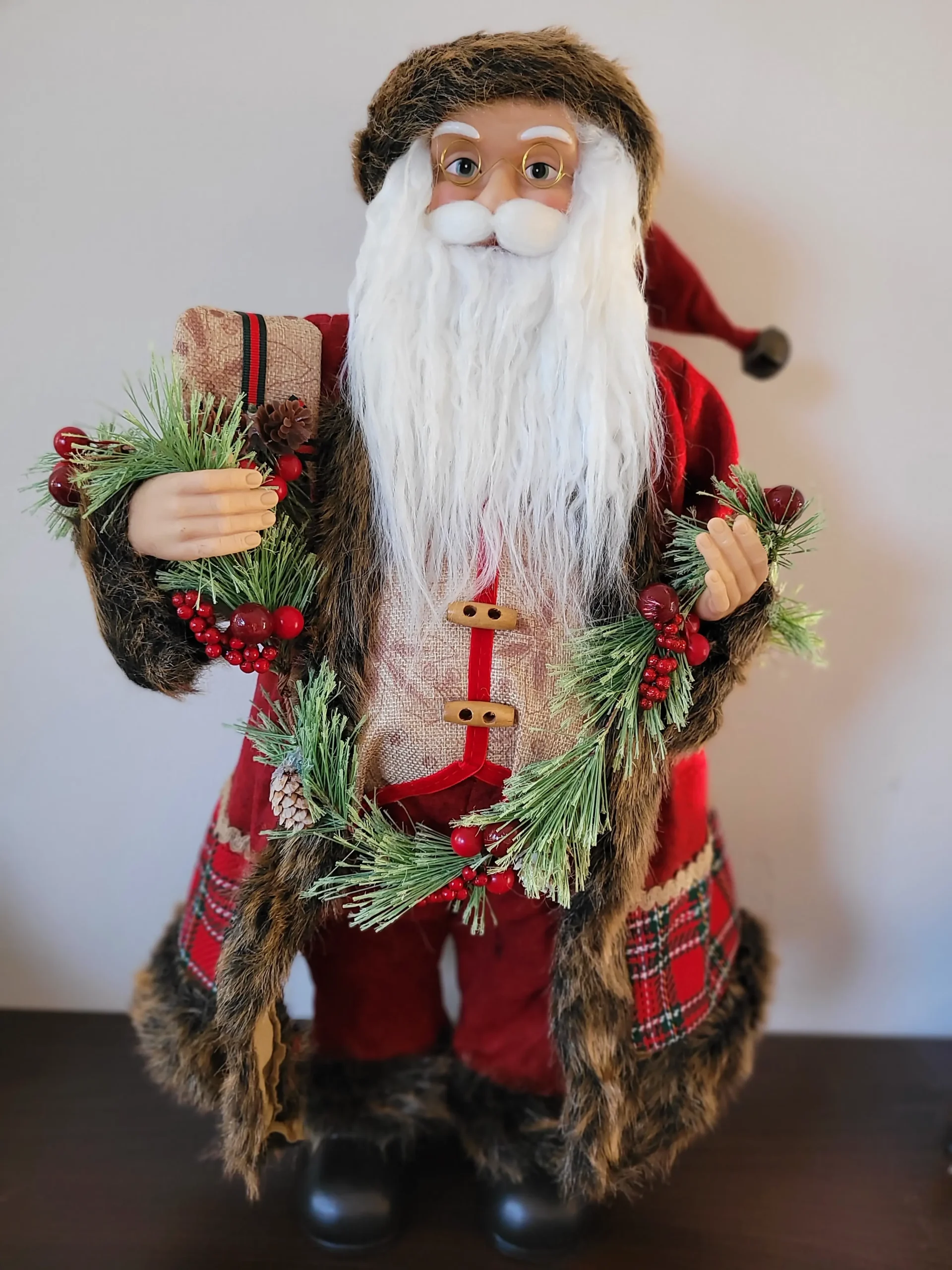 Rendkívül mutatós, nagyon szépen kidolgozott termék. Ennek a Mikulásnak/ Télapónak nem csak a szakálla, hanem még a bajúsza is puha szőrméből készült, rusztikus stílusú ruhája prémium minőségű anyagokból készült. Kezeivel egy mutatós girlandot és egy ajándékot tart.